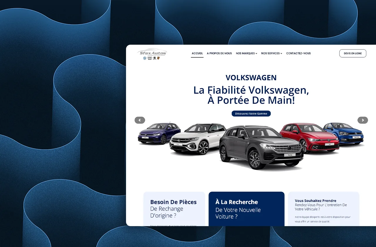 Our collaboration with Sfax Autos allowed us to design a website that embodies their dedication to quality and customer satisfaction. As an authorized ENNAKL agent and the official representative of renowned brands like Volkswagen, Audi, Seat, and Porsche in Tunisia.